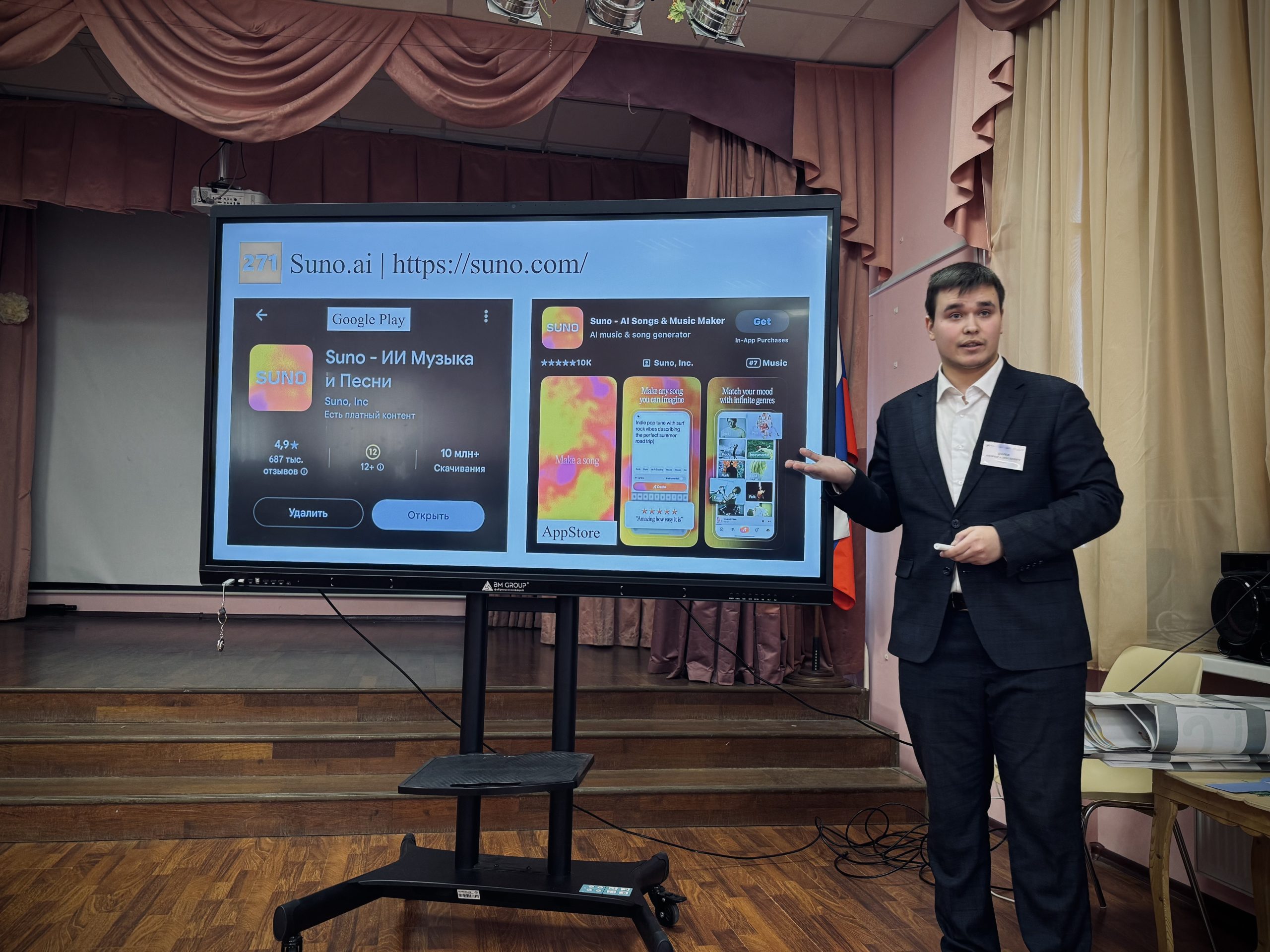 • А.А. Царев, учитель английского языка ГБОУ Гимназия №271, с темой «Формирование лексического навыка на уроке английского языка посредством генерации песен с помощью “Suno.ai”»