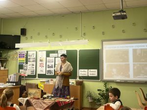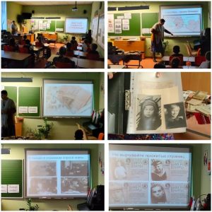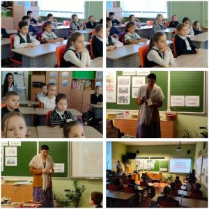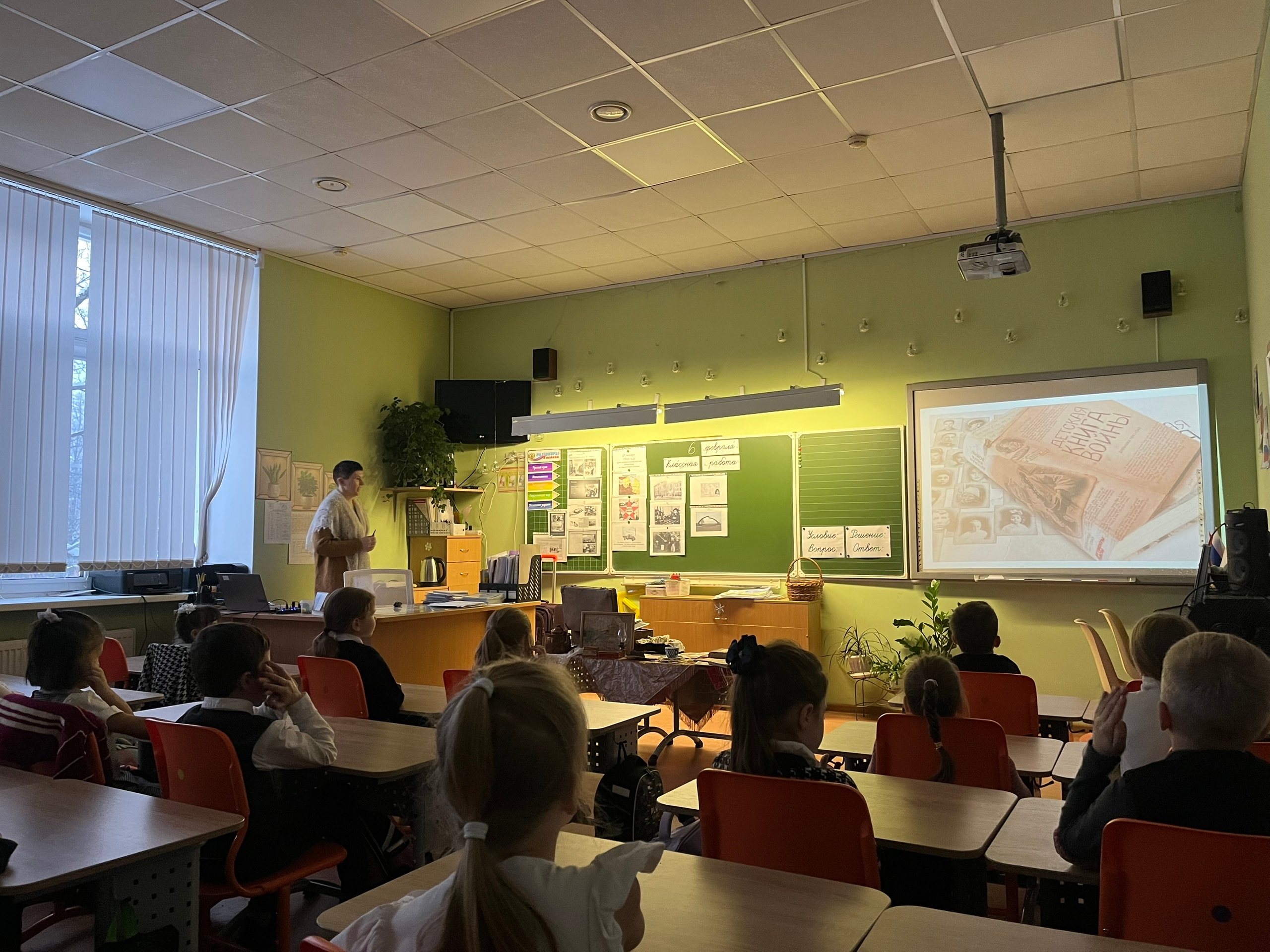 Школьники перенеслись в дни блокадного Ленинграда прямо в классе, погрузились в атмосферу военного времени и перелистали страницы детских блокадных дневников. Из подлинных рассказов дети узнали, как проходил обычный блокадный день, как учились в школе, какую музыку слушали, какие театры посещали их сверстники. Прозвучал рассказ о первой новогодней елке, дети увидели новогодние игрушки, пережившие блокаду и получили «блокадный подарок». На «блокадном уроке» пером и чернилами ребята переписали выданные индивидуально каждому стилизованную страничку блокадного дневника, чтобы всем классом восстановить летопись блокадной зимы. Атмосфера блокадного быта была воссоздана при помощи подлинных ВЕЩЕЙ ВОЕННОГО ВРЕМЕНИ и образа ведущего. Урок памяти провела экскурсовод Лебезкина Мария Николаевна, автор книги «Блокадная азбука». Подлинник книги Мария Николаевна подарила классному руководителю 1А класса (организатору школьного музея) Кобец Марине Николаевне.