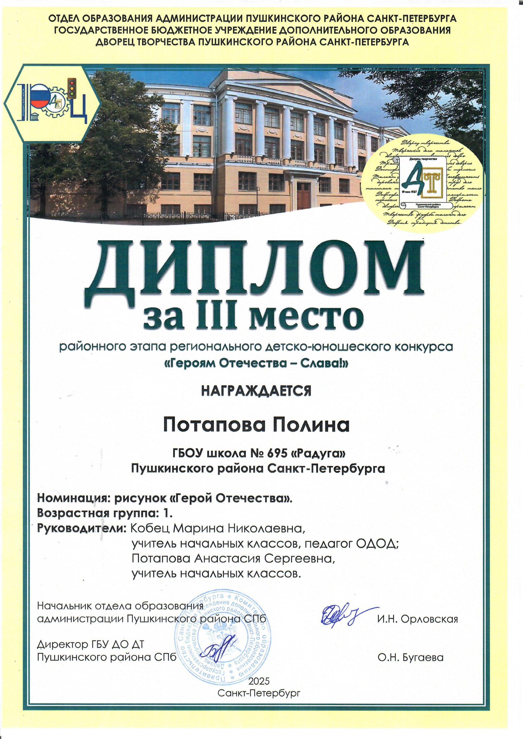 От всей души поздравляем учащихся 1 «А» класса — Поздеева Фёдора и Потапову Полину с восхитительными результатами на конкурсе рисунков «Герой Отечества»! Руководители: Кобец Марина Николаевна и Потапова Анастасия Сергеевна.