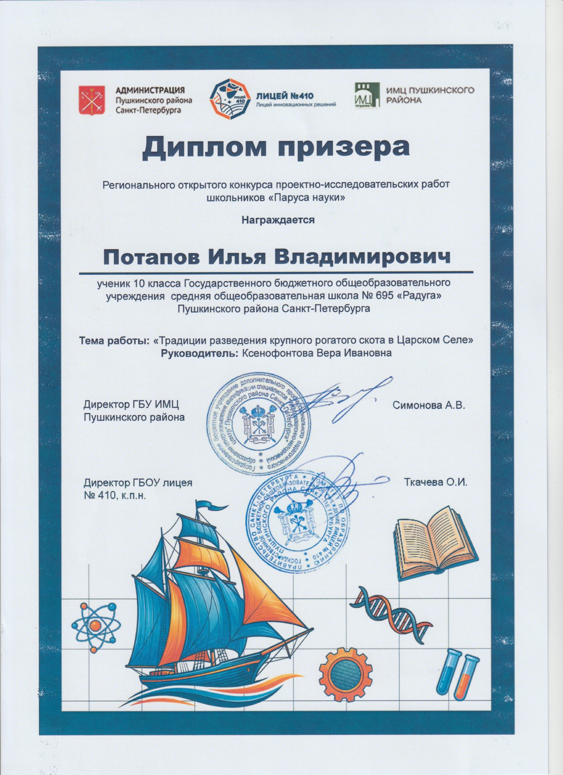 Торжественную церемонию открыли Ольга Ильинична Ткачева, директор лицея №410 и Анастасия Валерьевна Симонова, директор ИМЦ Пушкинского района. В своём приветствии они отметили талант и упорство школьников, вдохновив всех присутствующих на новые научные свершения. Масштаб конкурса в этом году впечатлил: 47 образовательных учреждений из 14 районов Санкт‑Петербурга подали заявки, а к очному этапу жюри допустило 184 научно‑исследовательских проекта. И вот — долгожданные итоги: 15 ребят стали победителями, ещё 55 заслужили звание призёров. Нашу школу представили Лащук Леонид 5А класс, Полищук Дина 5А класс, Потапов Илья 10А класс