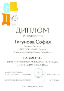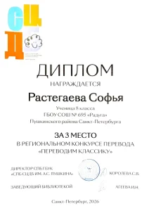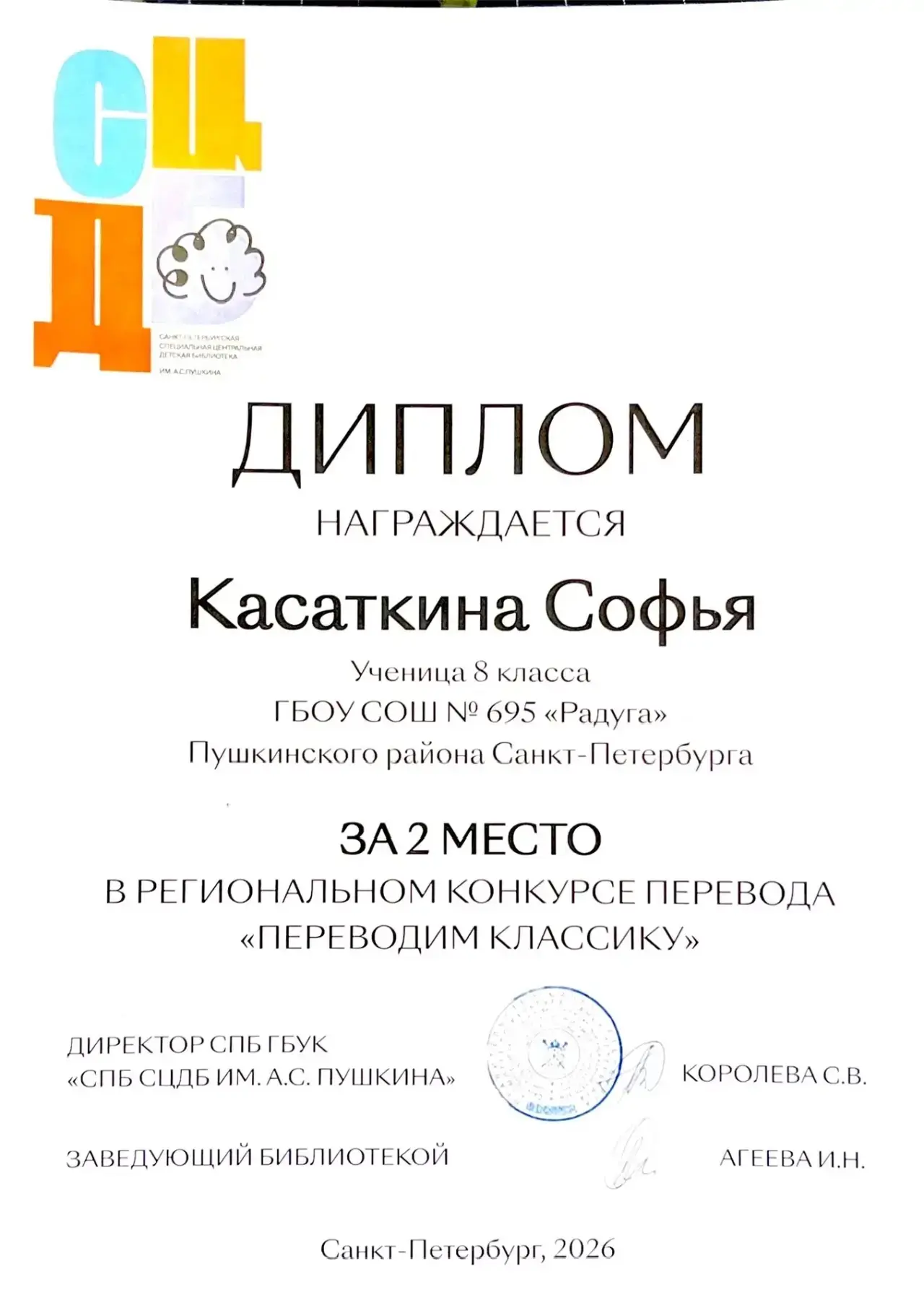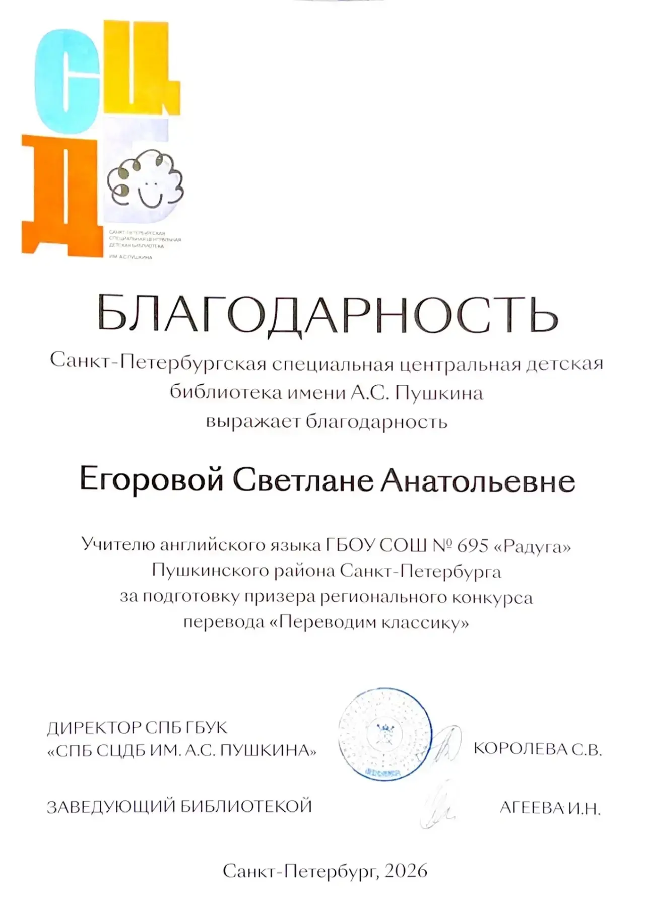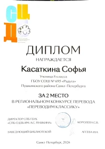 Конкурс проводила Санкт-Петербургская специальная центральная детская библиотека им.А.С.Пушкина. Дипломы вручала переводчик прозы и поэзии — Александра Викторовна Глебовская. Педагоги, подготовившие учащихся — Егорова Светлана Анатольевна и Михайловская Анна Дмитриевна, учителя английского языка. От всей души гордимся и желаем дальнейших успехов в изучении иностранных языков!
